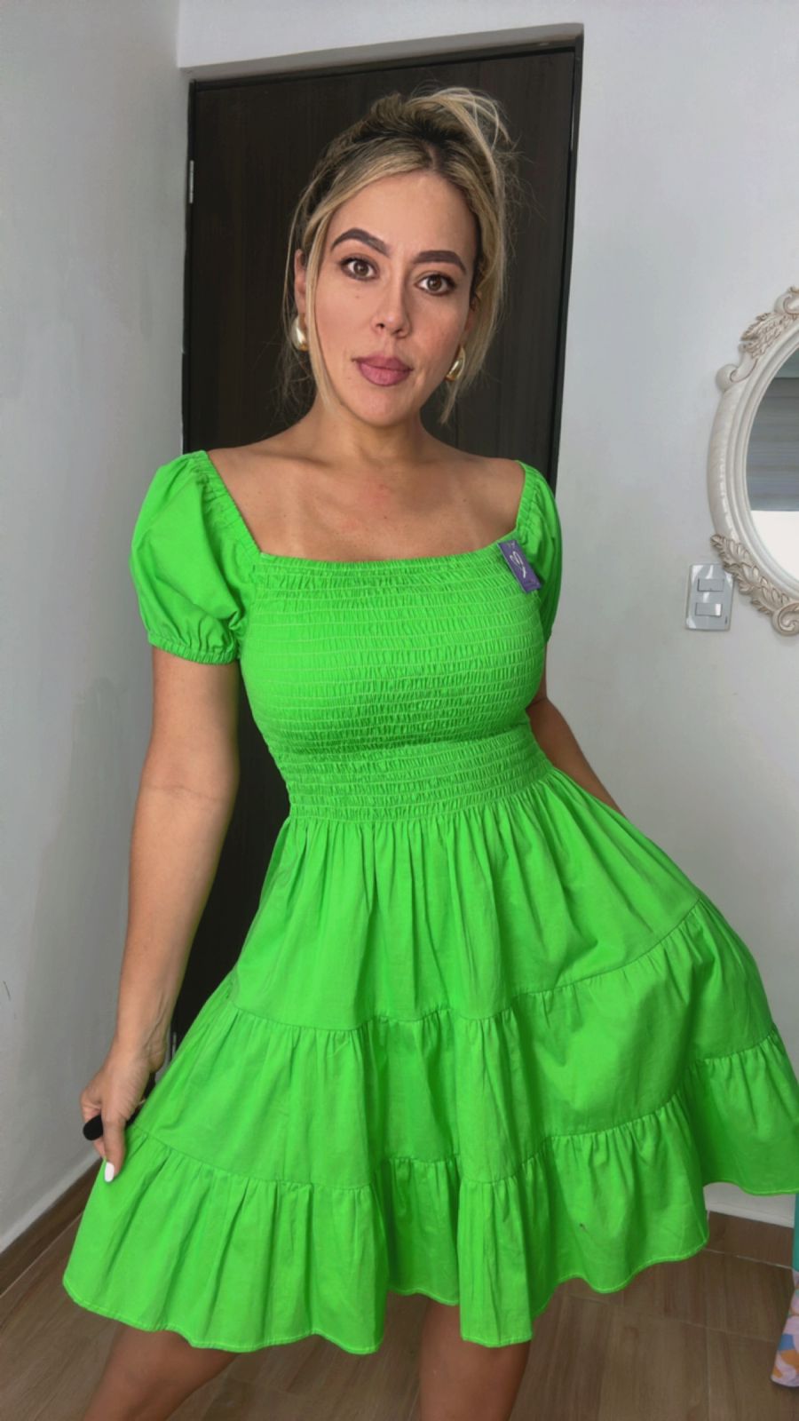 Vestido verde viche con manga media bombacha y resorte en la parte superior, que se ajusta al busto. Estilo romántico y cómodo