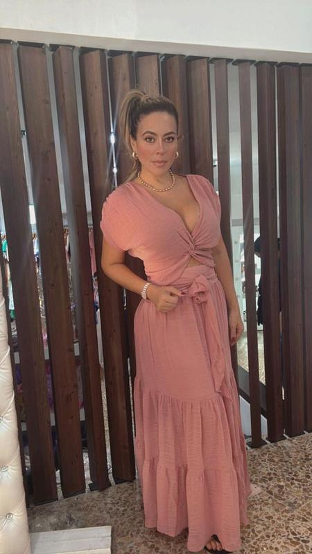 Falda y camisa en silueta holgada, con un moño delicado que eleva el look sin esfuerzo. El tono palo rosa aporta suavidad y luminosidad, ideal