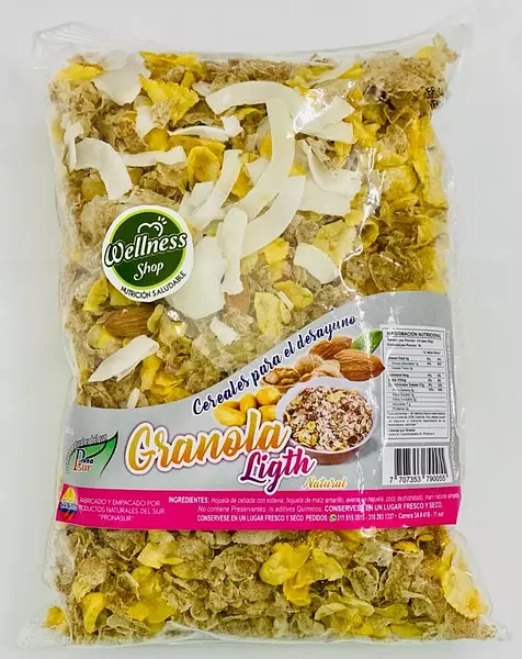 Hojuelas de cebada con estevia, hojuela de maiz amarillo, avena en hijuelas,coco deshidratado, mani natural, almendra.