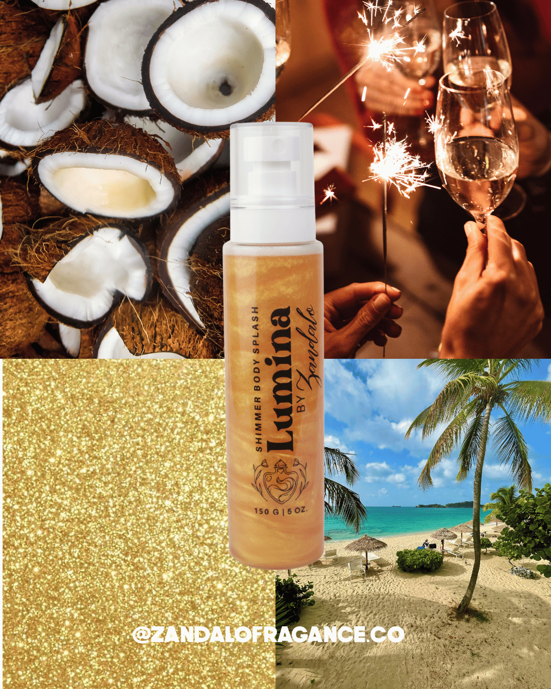 Lumina Dorado es un body shimmer que ilumina la piel con un brillo dorado cálido y elegante, mientras la envuelve en un aroma tropical irresistible de coco cremoso y frutas tropicales. El resultado es una fragancia solar, dulce y vibrante que eleva cualquier look y mood al instante.